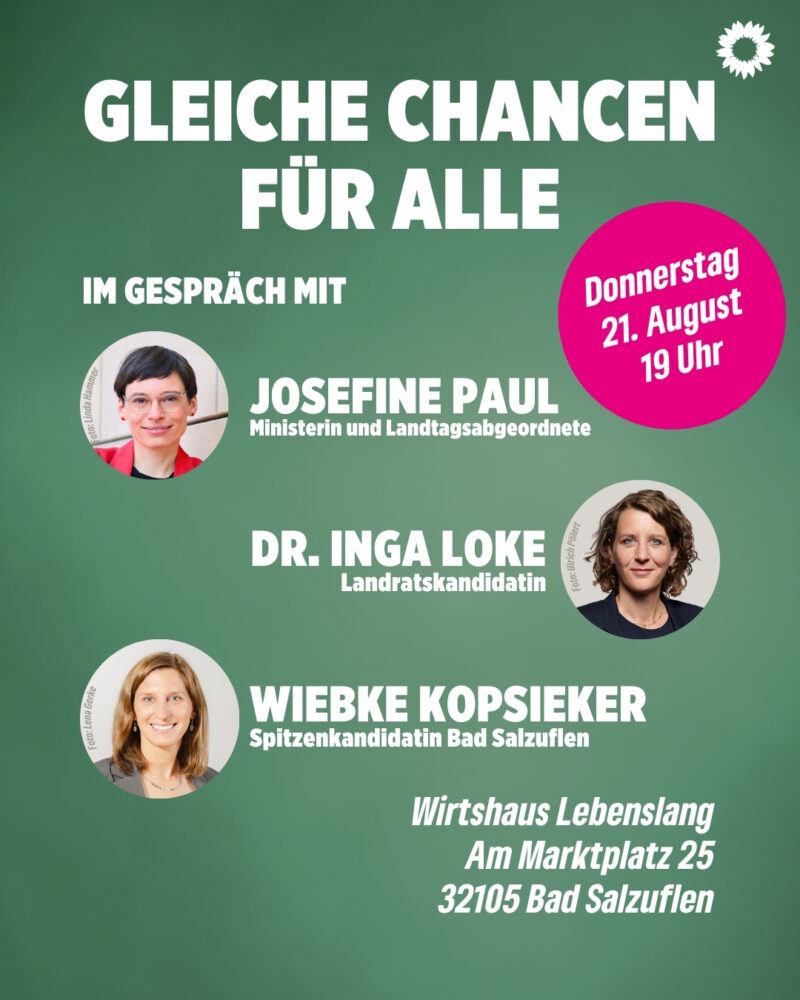Am Donnerstag, den 21. August, um 19 Uhr begrüßt der grüne Kreisverband Lippe im Wirtshaus Lebenslang, Am Marktplatz 25, in Bad Salzuflen die grüne Ministerin und Landtagsabgeordnete Josefine Paul. Mit ihr diskutieren Dr. Inga Loke, Landratskandidatin für den Kreis Lippe, und Wiebke Kopsieker, Spitzenkandidatin für Bad Salzuflen.
